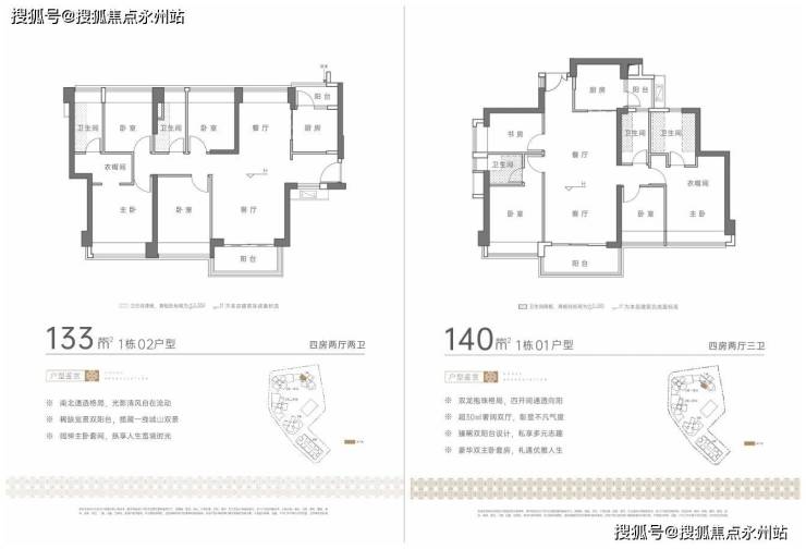还有一个四开间朝南四房户型,也称双龙抱珠格局,超30㎡的阔绰双厅,豪华双主卧套房,三卫生间设计